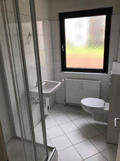 Die helle Einbauküche mit einem Cerankochfeld, Backofen und einem Kühlschrank mit Gefrierfach befindet sich in einem gepflegten Zustand- Hier können Sie eine Waschmaschine und einen Geschirrspüler anschliessen. Das Badezimmer ist mit einer Dusche ausgestattet und verfügt über ein großes Außenfenster, welches den Raum erhellt und für eine gute Belüftung sorgt.
