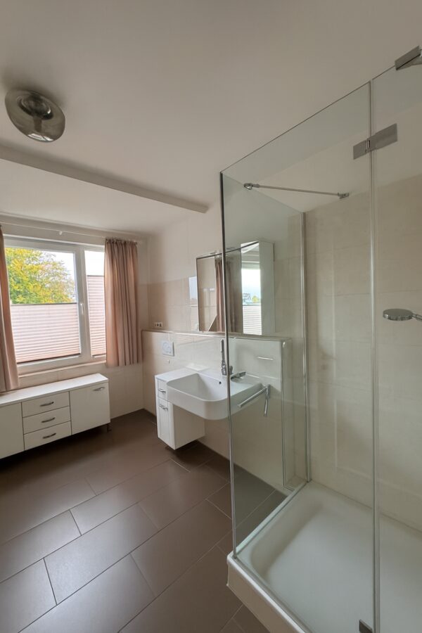Das moderne Badezimmer verfügt über eine Badewanne, eine separate Dusche, ein Waschbecken sowie ein WC. Ergänzend dazu steht ein separates Gäste-WC mit Waschmaschinen- sowie Trocknerstellplatz zur Verfügung. Ein praktischer Abstellraum befindet sich direkt in der Wohnung und bietet zusätzlichen Stauraum. Alle Räume sind mit entsprechenden Multimediadosen ausgestattet.